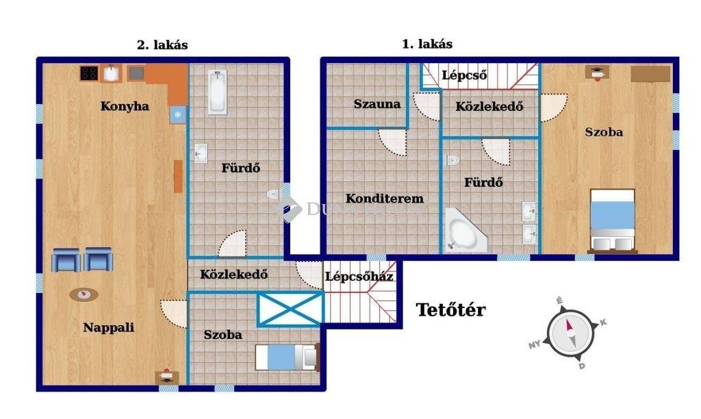 A 2. lakás tágas konyha - nappalival, fürdőszobával és szobával rendelkezik.