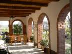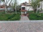 Az udvar térkövezett, disznövényekkel díszített. A pihenő területhez dézsafürdő, filagória és egy kis halastó is tartozik. A terület többi részén gyümölcsfák és veteményes kert található.