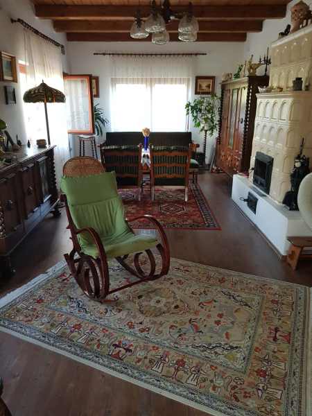 A 32 m2 nappaliban nagy méretű cserépkályha biztosítja a kellemes.