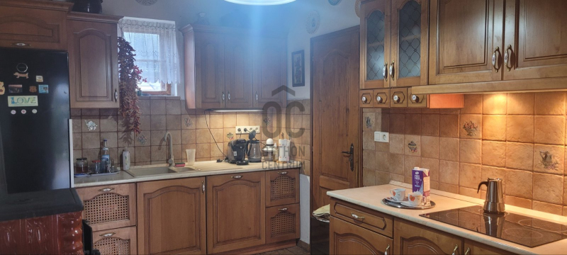 A nagy méretű konyhában beépített bútorok találhatóak teljes gépezettel és egy fatüzelésű cserépkályha jellegű sparhelt található.
