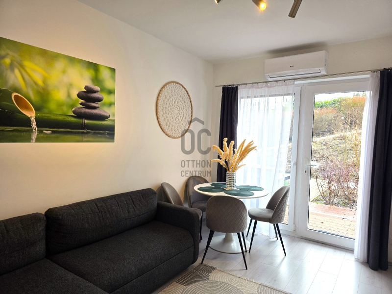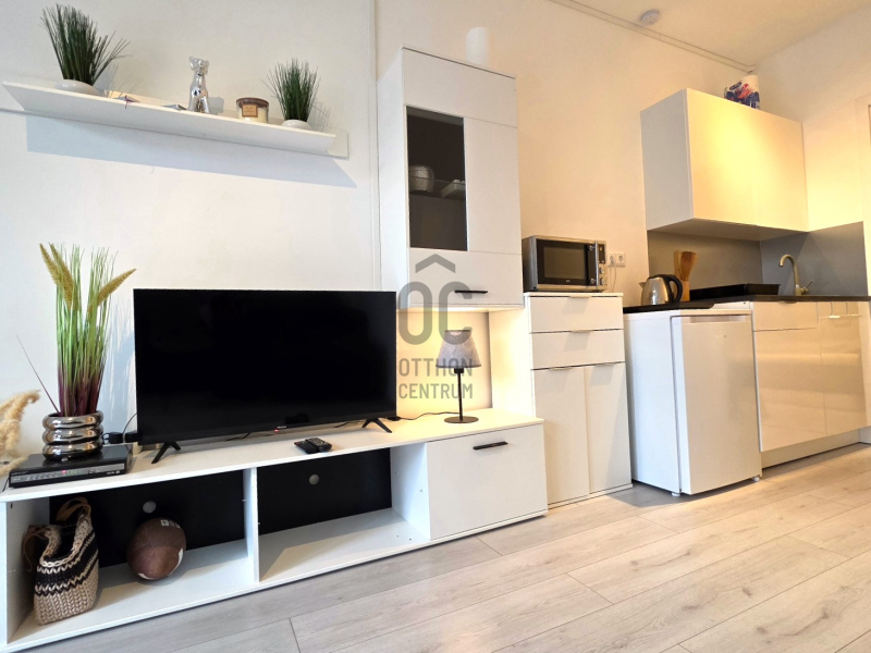 A lakás nettó 32nm, amihez egy déli tájolású, +8nm-es terasz tartozik, amely motoros napernyővel védett.