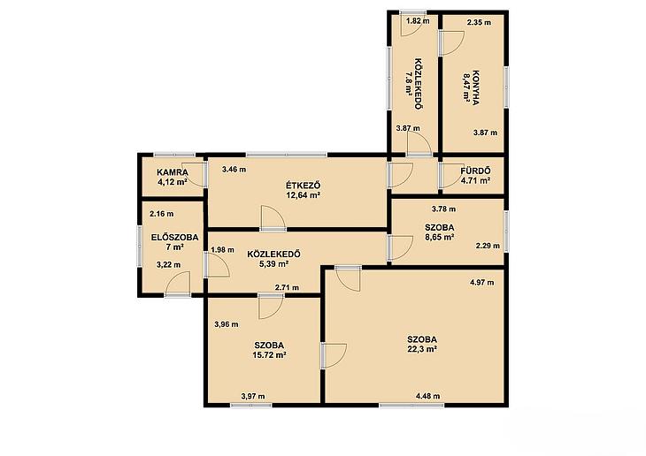 3 szoba, nappali, konyha, fürdőszoba kádas kialakítással + mellékhelyiség, előszoba, közlekedő, tároló.