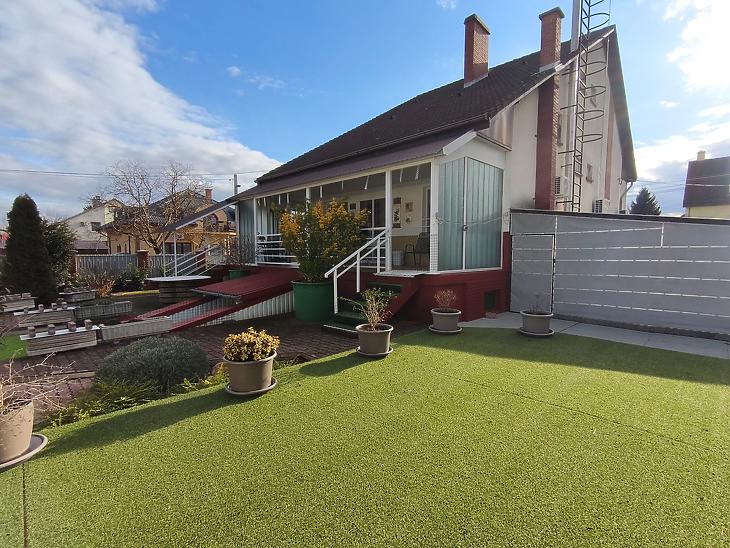 A ház földszintjén egy 50 m2-es mozaiklappal burkolt fedett terasz található, valamint a felső szinten egy 4m2-es fedett, a hálószobából nyíló erkély is kialakításra került