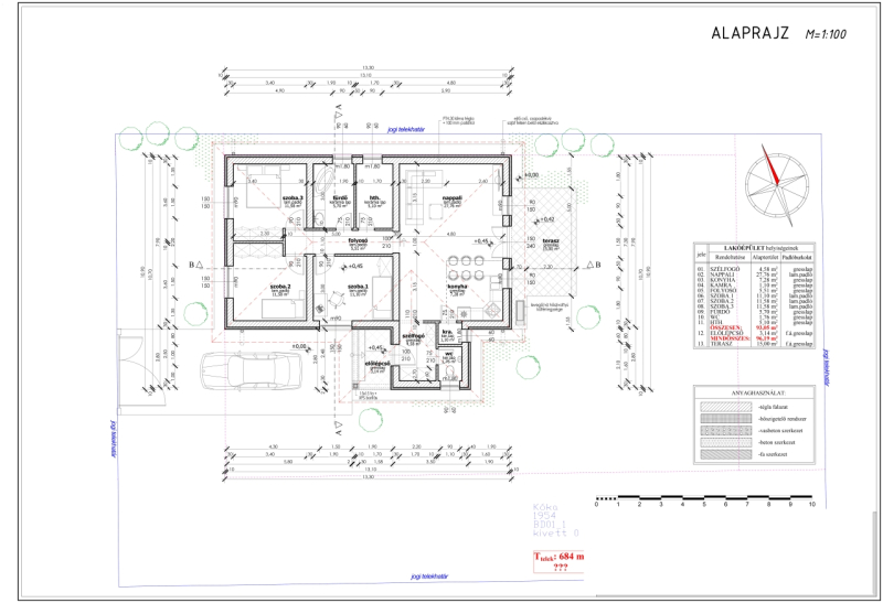 A tartószerkezeti falak Porotherm P30N+F téglából, betonkoszorúval, fa födémes tetőszerkezettel készülnek. A lábazat 10 cm polisztirol lépésálló, a homlokzatok 15cm-es EPS, a vízszintes födém 30 cm ásványgyapot szigeteléssel lesz ellátva.