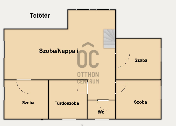 ■ Az emeletre lépcsőn jutunk fel, ahol nappali, három különnyíló nagy méretű szoba, egy fürdőszoba és Wc található.