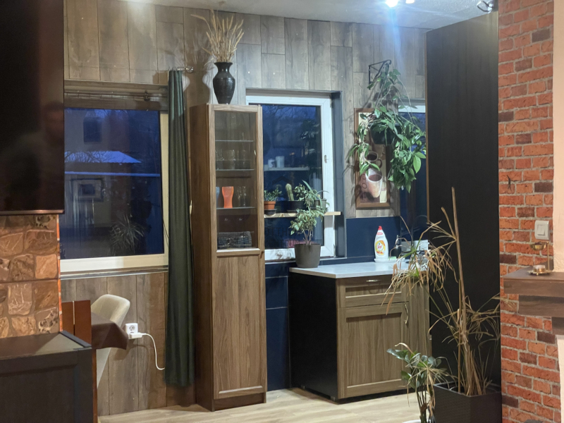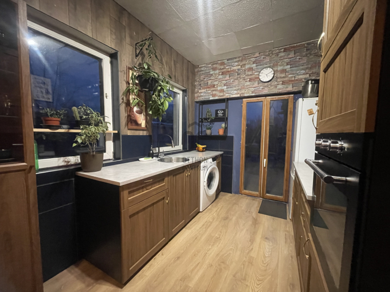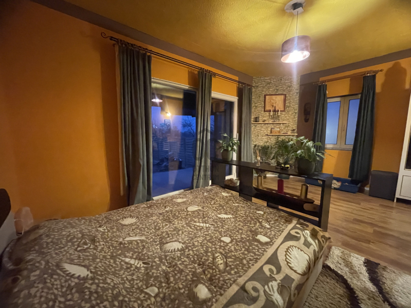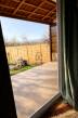 •hátsó lakrészben nagy méretű tolóajtó a terasz felé, kiváló fényviszonyokkal és panorámával a Börzsöny hegyeire, konyhában a terasz ajtó fa