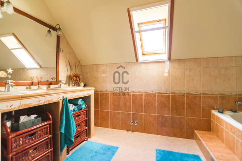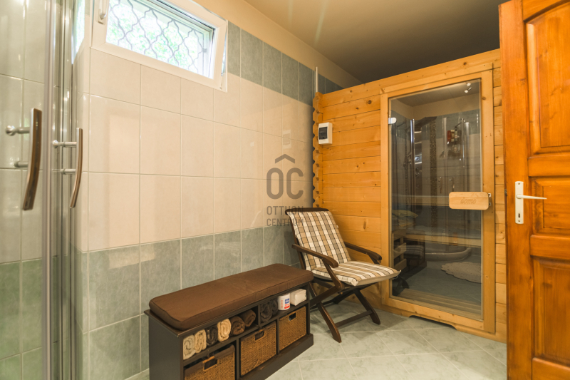 A házban szintenként egy-egy fürdőszoba és külön WC található, a földszinti fürdőben szauna is beépítésre került, ami tovább növeli a komfortérzetet. Ezen kívül egy külön háztartási helyiség/mosókonyha, egy gépészeti helyiség, valamint egy praktikus spájz is rendelkezésre áll.