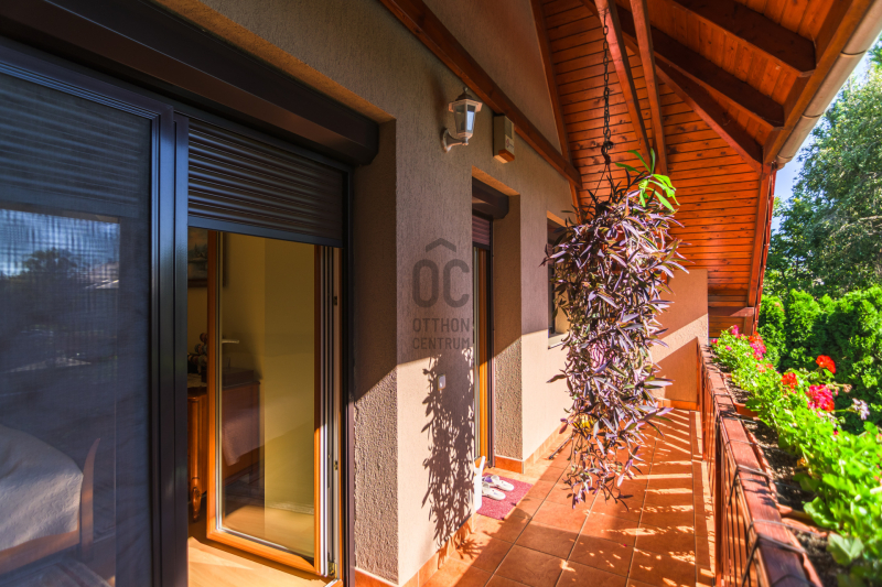 A gondozott kert igazi pihenőkertként funkcionál: privát medence, fedett grillterasz, zöldfelületek és virágos növényágyások teszik teljessé a kertvárosi életérzést. A kertben egy különálló faház-tároló is megtalálható, ideális kerti eszközök vagy szezonális holmik elhelyezésére.