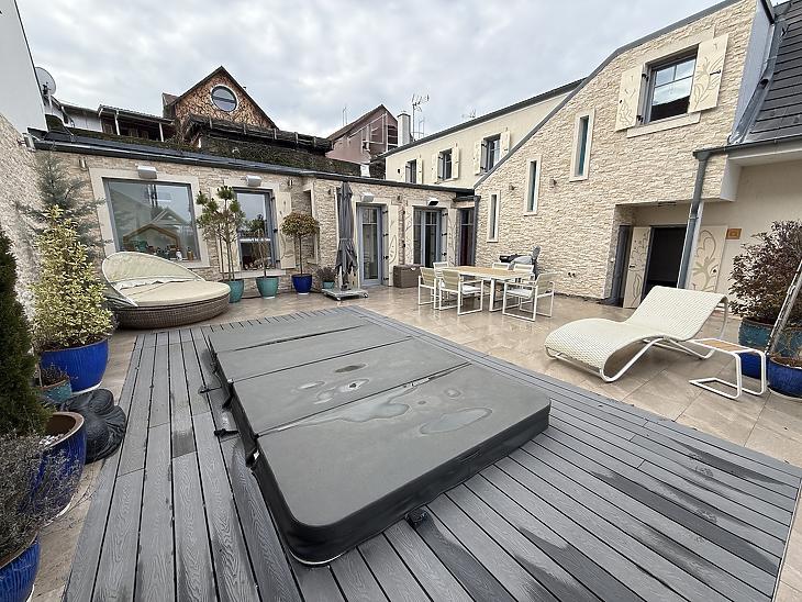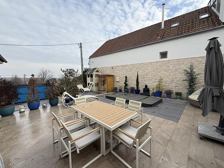 -A kertben kialakított szauna és a beépített medence igazi különlegességet jelentenek, amelyek tökéletes kikapcsolódást biztosítanak az év minden szakaszában.