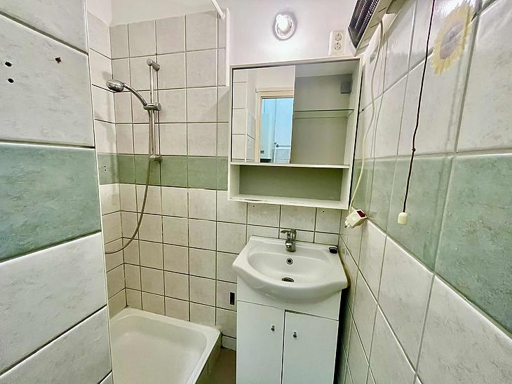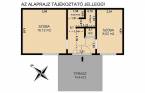 A telek végében elhelyezkedő, különálló házban balra és jobbra található egy-egy világos, DNy-i irányba, kertre tekintő szoba. Az előtérből egyenesen juthatunk a főzőfülkéhez, a zuhanyzós fürdőhöz és egy külön leválasztott wc-hez. A tető cseréppel fedett, fafödémes. A szobák fűtését gázkonvektor biztosítja. A bejárat előtt egy 14 m2-es burkolt terasz található.