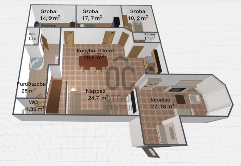 Élettér: előszoba, nappali+ konyha+ étkező egyben, 4 hálószoba, fürdőszoba , 2 WC, kamra, terasz, garázs
