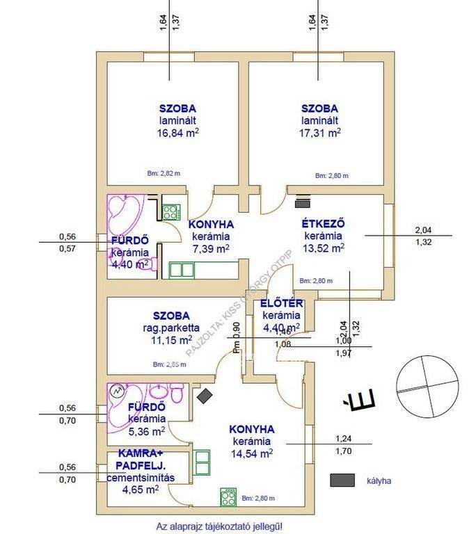 Helyiségek: 2 szoba, 1 félszoba, 2 konyha, étkező, 2 fürdő (WC-vel), előszoba, kamra, a melléképület alatta pince.