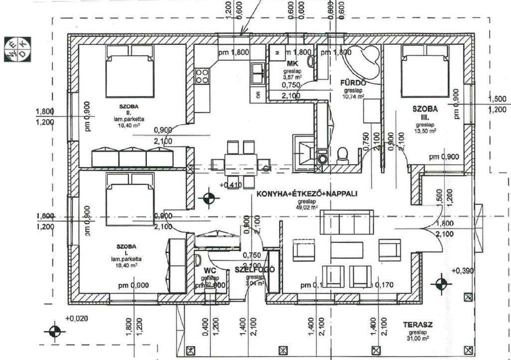 Helyiségek: 3 szoba, konyha-étkező-nappali, fürdő, WC (külön), mosókonyha, szélfogó.