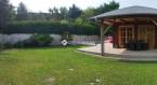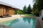 A nappaliból jutunk ki a medencéhez a napos teraszra és a szép, zöld növényzettel körbevett kertbe.