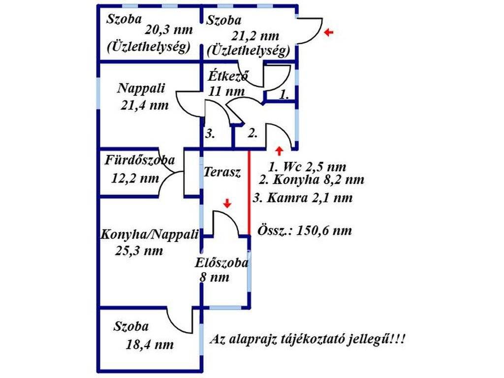 két szoba amelyek üzlethelyiségként, irodaként vagy szalonként is hasznosíthatók, egy tágas nappali, étkező, konyha, kamra és külön WC került kialakításra.