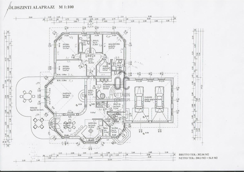 Az utcafront irányába helyezkedik el a három állásos garázs ahonnan a házba is be lehet jutni. Hatalmas nappali, részben szeparált konyha és étkező együttes közvetlen fedett és egy másik nyitott teraszkapcsolattal, valamint négy szoba , két fürdőszoba, tárolók, gardrób és kazánhelyiség-mosókonyha beosztású.