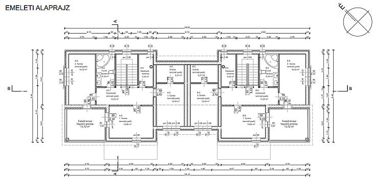 Emelet: 3 db Hálószoba, fürdőszoba, gépészeti helyiség és egy fedett terasz.