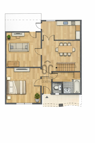 • földszinten: nappali, konyha, étkező, hálószoba, fürdő, külön WC, nagy terasz