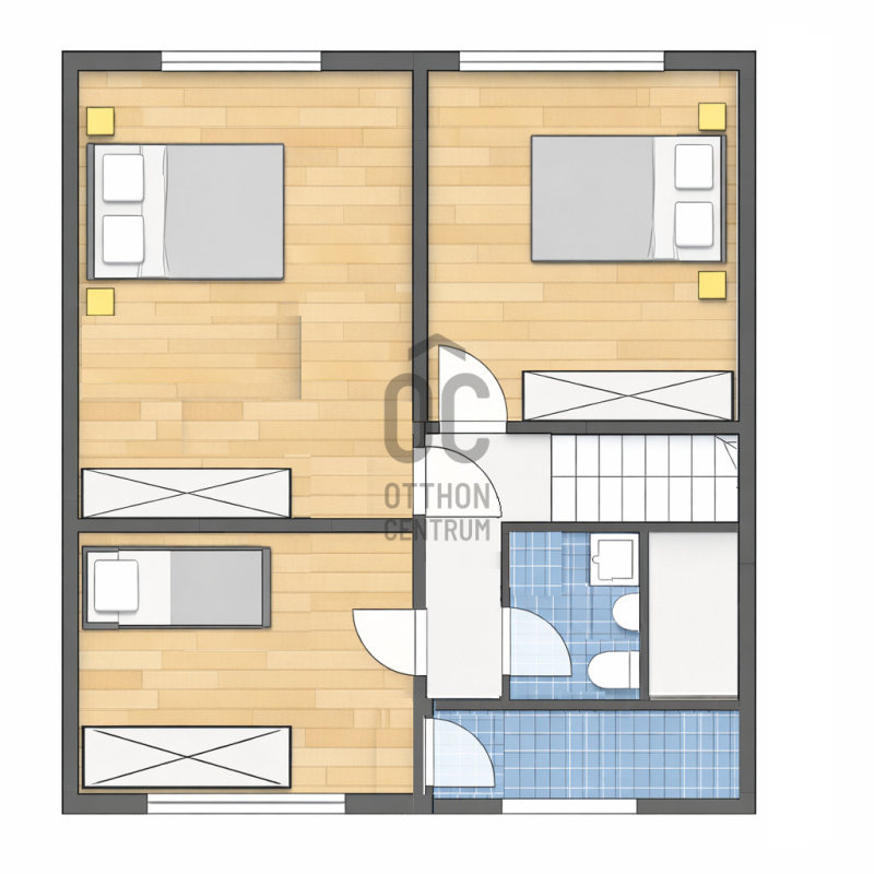 • emeleten: 3 hálószoba, fürdőszoba-WC, erkély