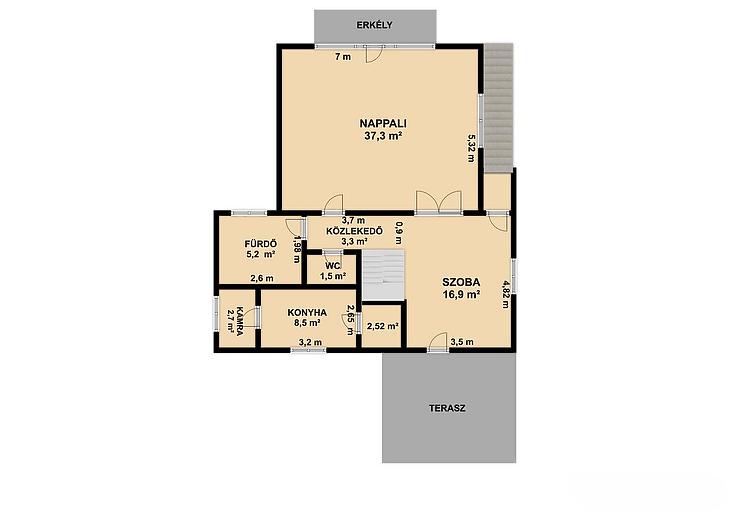 Emelet: 4 szoba, fürdőszoba + mellékhelyiség, közlekedő, 2 erkély.