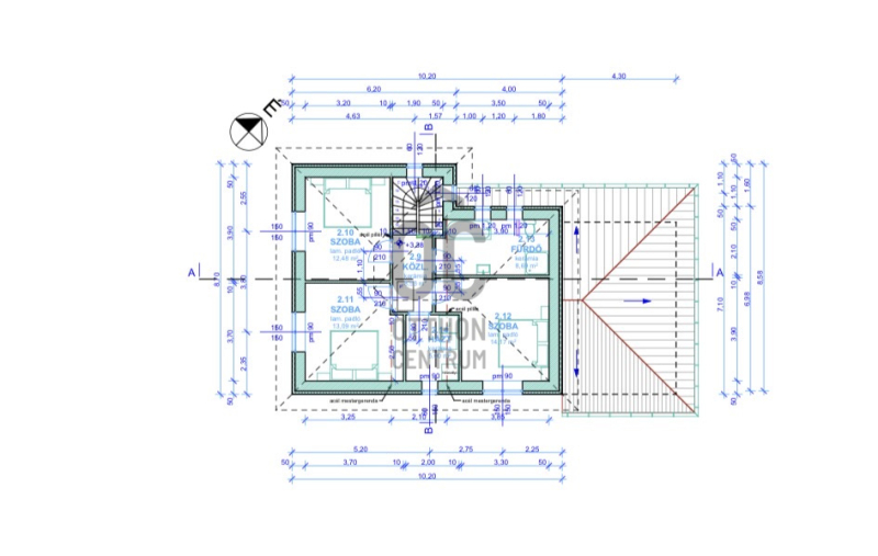 Felső szint:3 szoba, háztartási helység, fürdő-wc