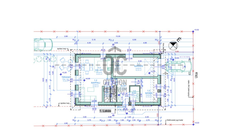 Felső szint:3 szoba, háztartási helység, fürdő-wc