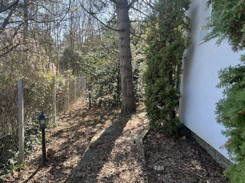 A telek két utca között helyezkedik el, így mindkét oldalról biztosított a bejárás, amelyet elektromos kapu tesz kényelmessé. A csendes, természetközeli környezet nyugalmat kínál, miközben Leányfalu központja és a szükséges infrastruktúra könnyen elérhető.