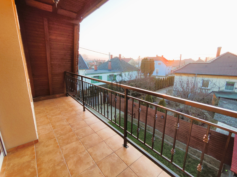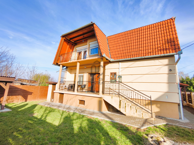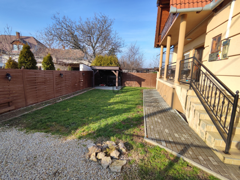 A 327 m²-es telek teljesen körbekerített, rendezett, gondozott, és egy fedett kiülővel is kiegészül. A ház környezetét térkő burkolat, terasz, valamint a felső szinten erkély teszi még komfortosabbá.