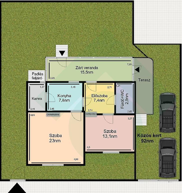 A telek használati megosztását tekintve, a szomszéddal még egy közös 92nm-es kert rész is tartozik a házhoz, ahol két autó beállási lehetősége adott.
