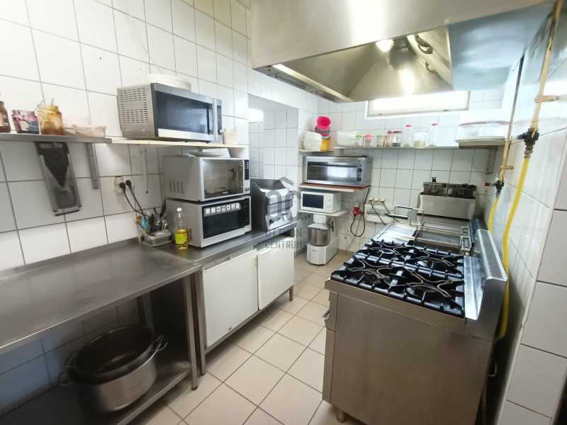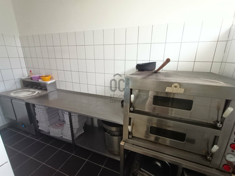 A földszinten a következő helyiségek találhatók: egy 36 m²-es nagyterem 30 fő befogadására, egy 25 m²-es kisebb terem, valamint egy 45 m²-es középső, pulttal kialakított vendégtér, összesen kb. 60 fő kényelmes fogadására alkalmas. A két nagyobb vendégtér között elhelyezkedő cserépkályha nemcsak a fűtésben segít, hanem kellemes hangulatot is teremt. A vendégek számára külön női és férfi mosdók állnak rendelkezésre. A teljesen felszerelt melegkonyha mellett külön pizzakonyha, fehér- és fekete mosogató, zöldség- és húselőkészítő helyiségek, szárazáru raktár, hűtő- és tejtermék raktár, valamint göngyöleg raktár biztosítja a zavartalan működést. A dolgozók részére külön öltöző került kialakításra, amely saját WC-vel, mosdóval és zuhanyzóval felszerelt, valamint egy irodahelyiség is kialakításra került.