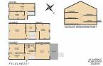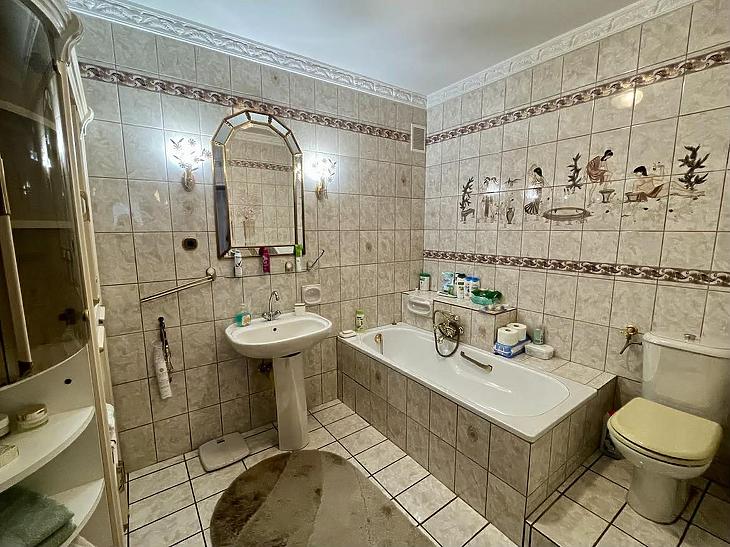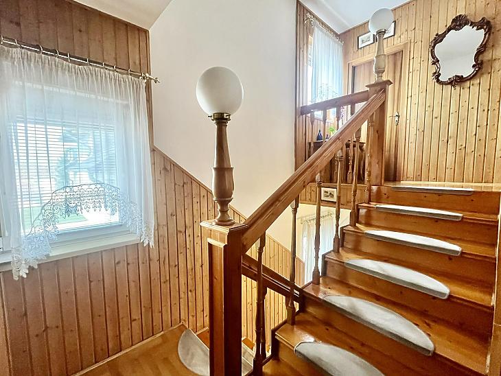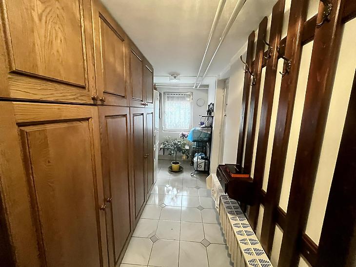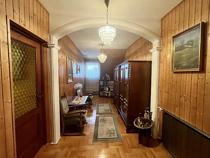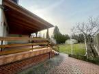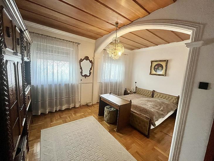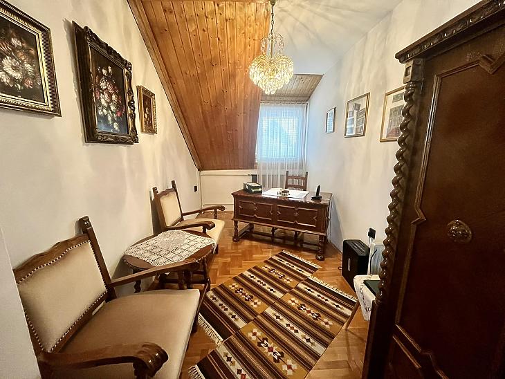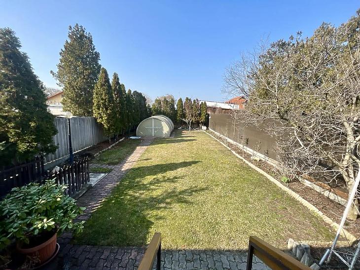 A nettó 131 m2 tégla ház 1991-ben épült szinteltolással. Előkert és tágas, rendezett kert tartozik hozzá. A földszinten található egy ablakos gardrób, tárolóhelyiség, hidromasszázs zuhanykabinos fürdő és fűtött garázs elektromos kapuval. Fél emelettel feljebb nyílik a nagy, étkezős konyha, amelyből a 16 m2-es fedett teraszon át a gondozott hátsó kertbe léphetünk ki. A félemeleten tágas, napfényes nappali helyezkedik el látványkandallóval, faberakásos mennyezettel, valamint a Valentino burkolatú, kádas fürdőszoba. Szintén fél emelettel feljebb található egy kertre néző hálószoba, amit a következő szinten két külön bejáratú hálószoba követ. Igény esetén a padlástér tovább bővíthető. Az ingatlan minőségi anyagokból épült, időtálló, igényes kivitelezéssel. Műanyag hőszigetelt ablakokra cserélték a nyílászárókat, a lépcsőházban 4 ablak fa maradt. Pala fedi a tetőt. A kertben fúrt kútról működő automata öntözőrendszert építettek ki és egy 6X3 méteres, lefedhető medencét, amit hideg-meleg vízzel lehet feltölteni. Kandeláberes kerti világítás és a tuja- és rózsasorral szegélyezett pázsit emeli az udvar hangulatát. A garázs mellett 3 autó számára zárt parkolási lehetőség is biztosított a térkővel burkolt udvaron. Riasztórendszer és kamerás kaputelefon van beépítve.