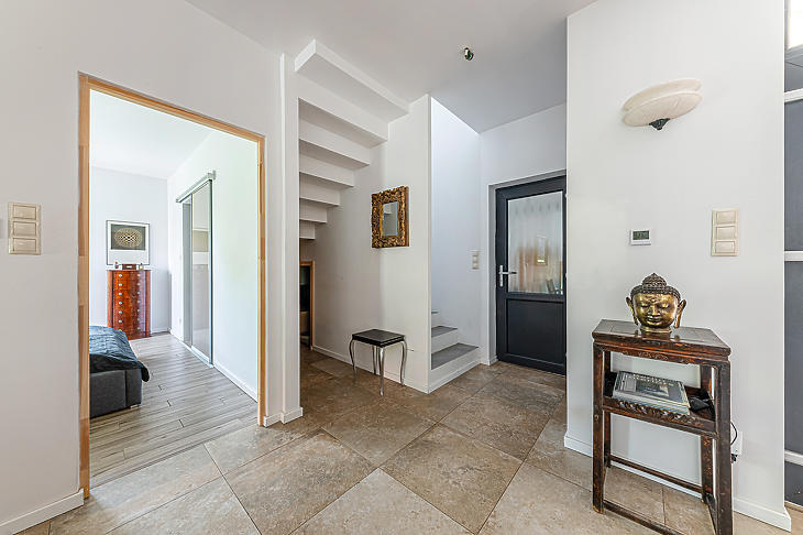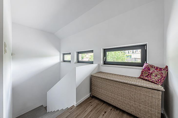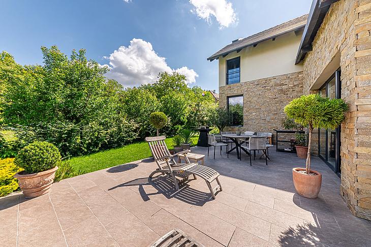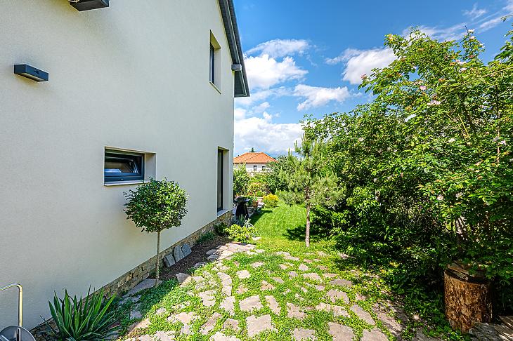 Budakalász kedvelt részén, csupán 15 perces sétára a HÉV megállótól helyezkedik el, így könnyen megközelíthető a város iskolái, óvodái, illetve üzletei egyaránt. A kilátás panorámás, továbbá a nyeles teleknek köszönhetően az intim szférából sincsen hiány. A ház és a kert gyönyörűen karbantartott, többek közt öntözőrendszer is kiépítésre került.