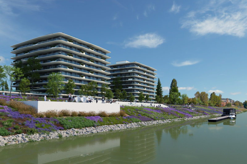 A lakóépületek modern, letisztult megjelenése a Duna vonalvezetését idézi.