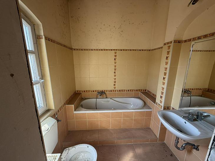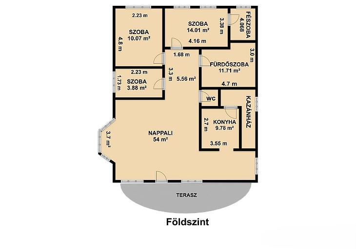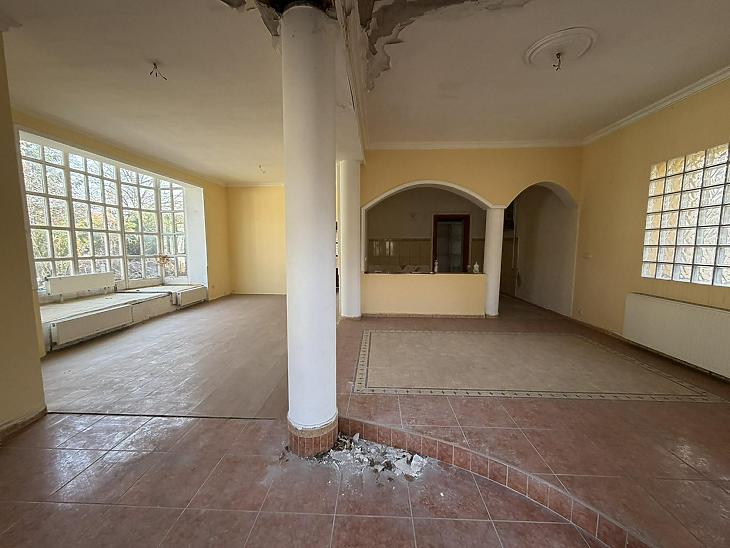 Földszint: 3 szoba, nappali, konyha, kamra, 2 fürdőszoba, wc, közlekedő.