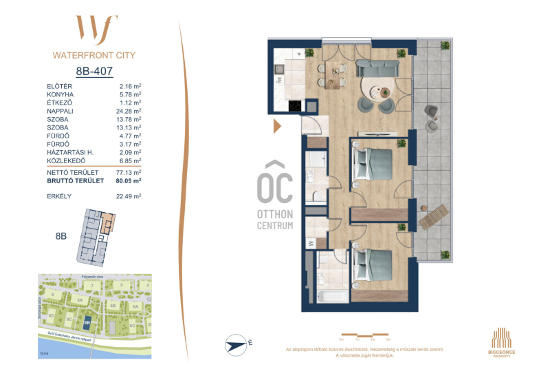 A Waterfront City egy új, modern városnegyed a 3. kerületben, ahol a természet közelsége és a városi kényelem tökéletes egyensúlyban van. A Duna-part közvetlen szomszédságában elhelyezkedő fejlesztés különleges atmoszférát kínál: a sétányt új épületek határolják, üzletekkel, kávézókkal és szolgáltatásokkal, amelyek élhető közösségi teret teremtenek.