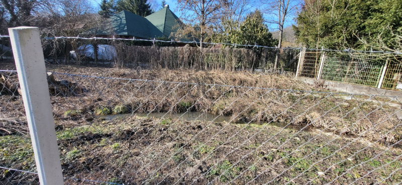 A telek minden oldalról körbekerített, melynek végét erdei patak szegélyezi.