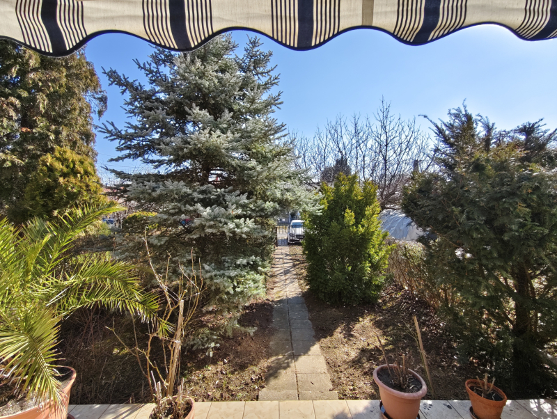 A telek rendezett, az előkert díszfákkal, növényekkel beültetett.
