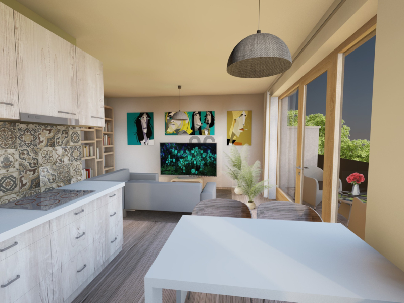 Garzonlakás (eladva) – előtér, nappali–konyha–étkező, fürdő