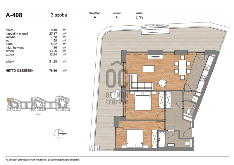 A teraszról a Duna látványa, a vízpart halk morajlása és a modern városi környezet tökéletes harmóniája adja az itt élők mindennapjainak különleges atmoszféráját.