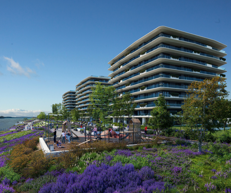 A lakóépületek modern, letisztult megjelenése a Duna vonalvezetését idézi.