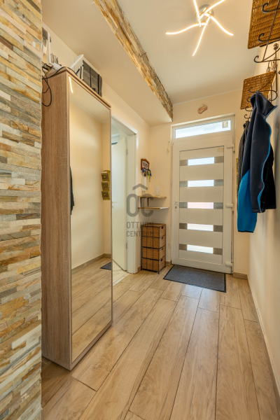 A 106 m²-es, kiváló állapotú ingatlan egy 250 m²-es telken, lakópark jellegű, zárt területen helyezkedik el, ahol a biztonság és az összetartó közösség kiemelt értéket képvisel. Az ikerház a szomszédos épülettel kizárólag a garázsnál kapcsolódik, így a lakótér teljes mértékben elszeparált, zajmentes életteret biztosít.