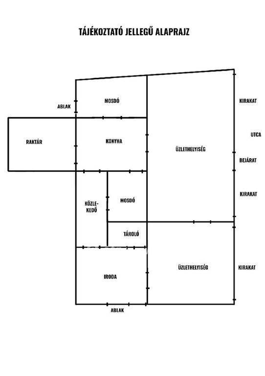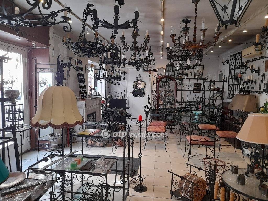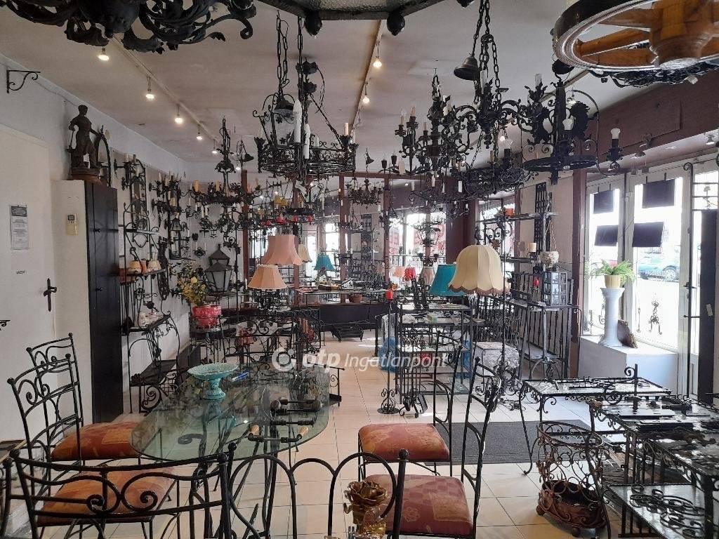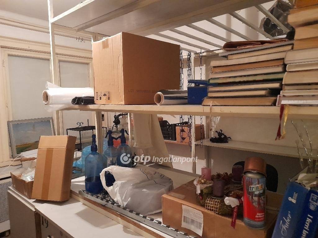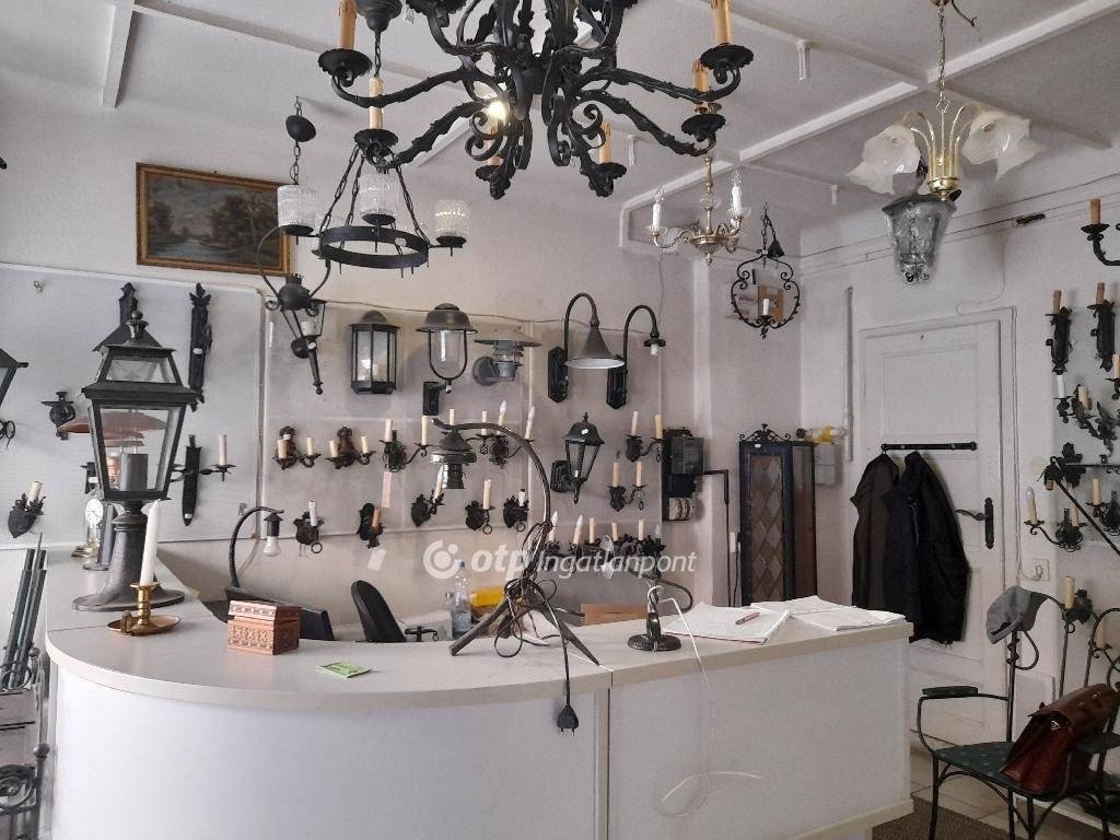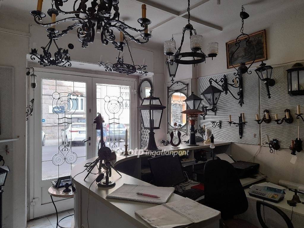 Több üzlet-lakás lett összevonva. Az alapterület nagyjából fele az eladótér, faltól-falig kirakatokkal. A hátsó részben van iroda, konyha, raktár, WC, fürdőszoba. 5 tulajdoni lapon van az ingatlan, természetesen csak egyben eladó