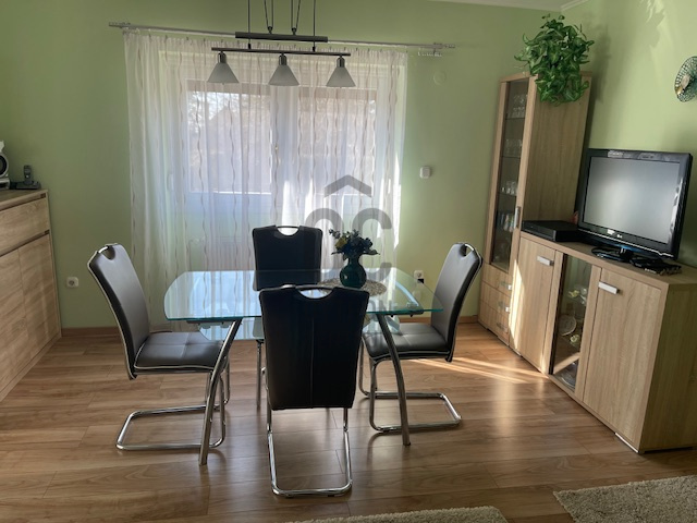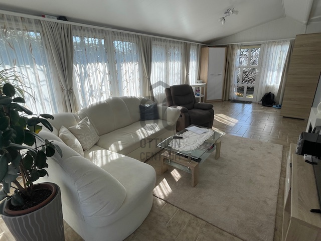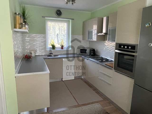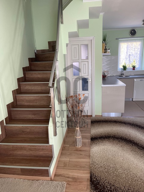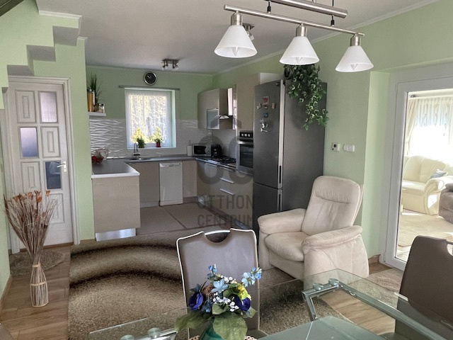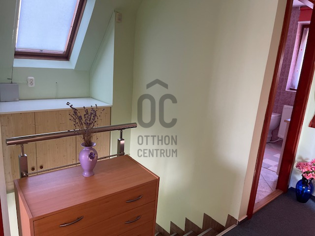 A tágas nappali világos és modern kialakítása a családi együttlétek méltó helyszínévé teszi, míg a 10 nm-es terasz a nyári estéken kínál kellemes pihenési lehetőséget. Az alsó szinten a nappaliból nyílik a tágas, 27 nm-es étkező-konyha, így bőséges hely áll rendelkezésre nagyobb családi- vagy baráti összejövetelek esetén is. A földszinti wc-kézmosó gondoskodik arról, hogy a vendégeknek ne kelljen igénybe venni a fenti fürdőszobát. A gázfűtés (cirko) és a klíma megfelelő hőmérsékletet biztosít bármely évszakban. A 3 külön nyíló szoba önálló teret biztosít a család minden tagjának. A hatalmas dupla garázs és a 28 nm-es tároló ritka érték, elnyeli az összes kacatot. A kerti szerszámok tárolásához önálló faház áll rendelkezésre.