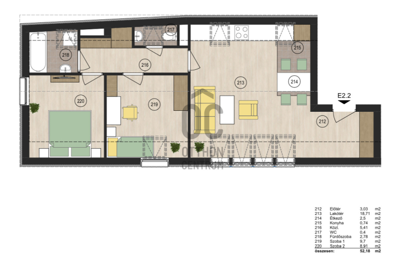 Tetőtér : 2 db lakás ( egyik lakás : 57,2 m2 , a másik lakás: 52,18 m2 )