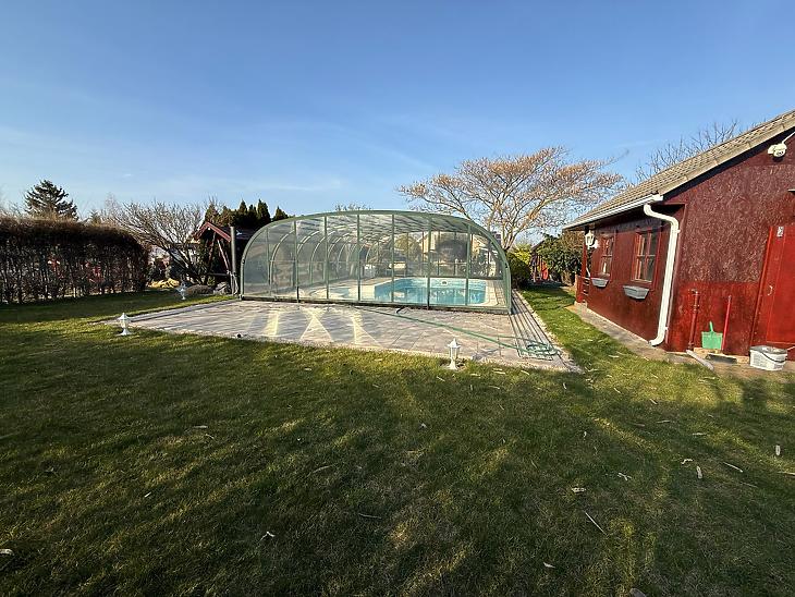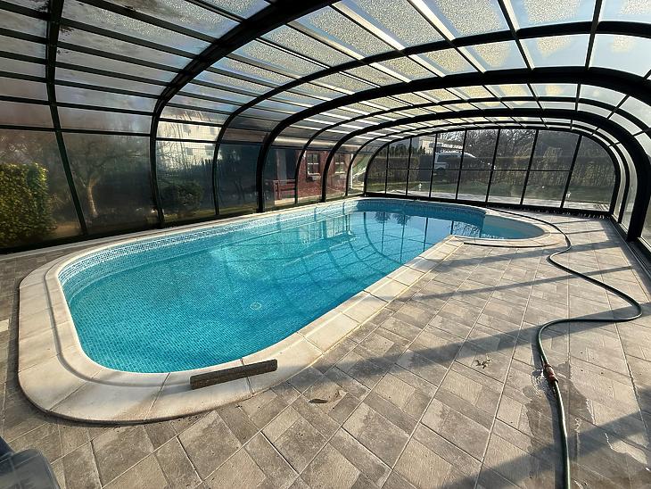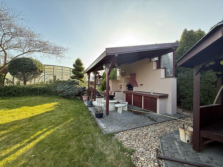 A telken, egy fűtött és fedett medence, valamint egy hangulatos kültéri kemence és grill sarok került kiépítésre.