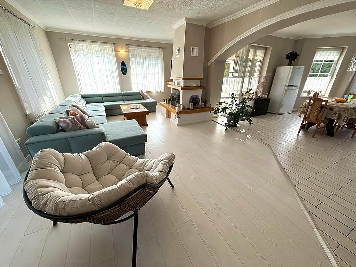 A földszinten tágas nappali található kandallóval, amely kellemes hangulatot teremt.