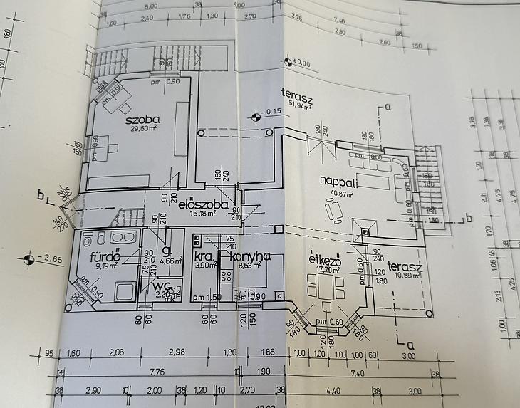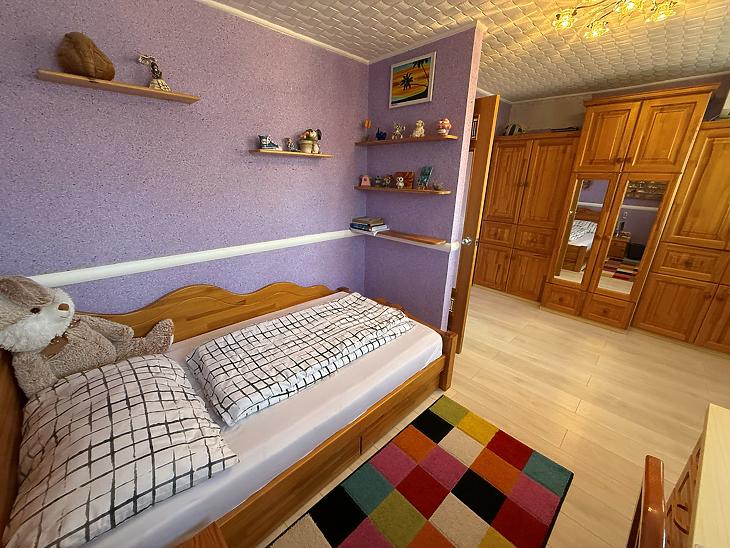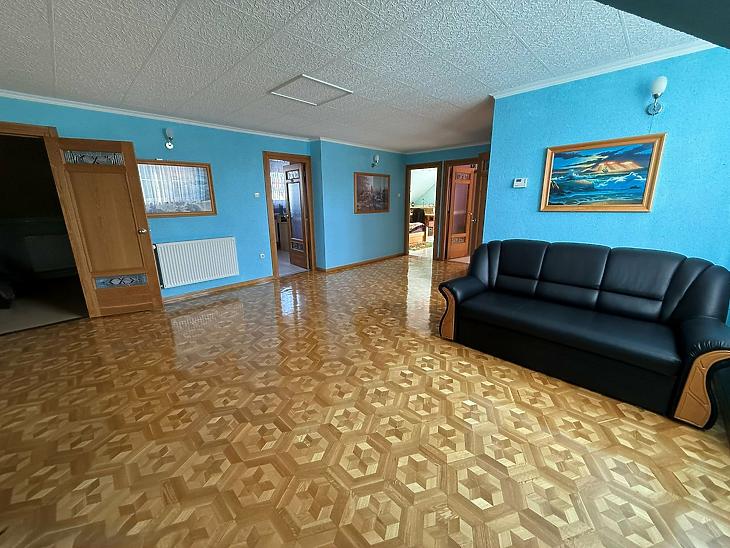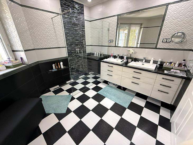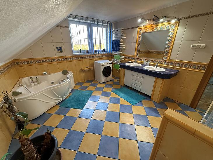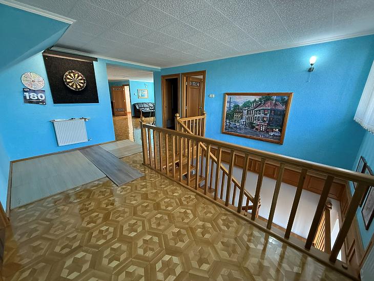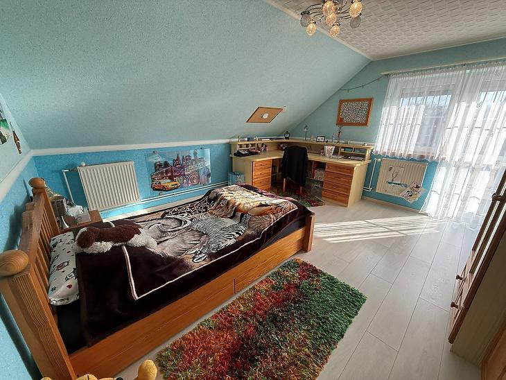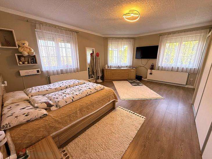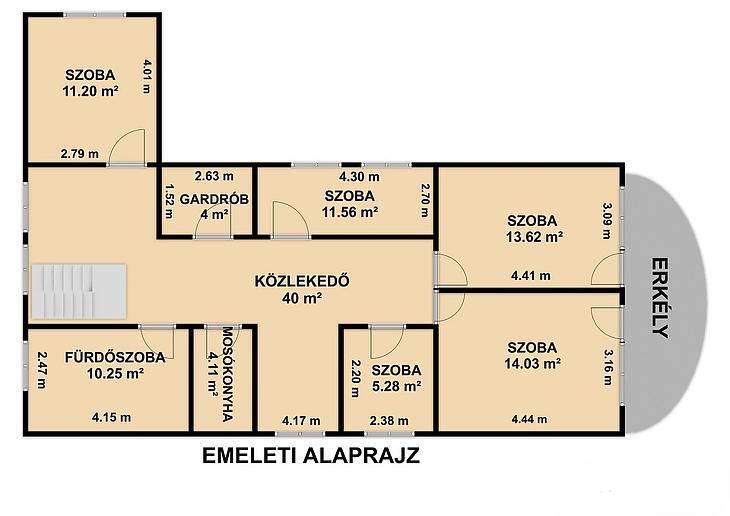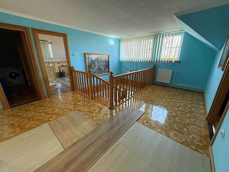 Emelet: 5 szoba, kádas fürdőszoba, + wc, gardrób, közlekedő, mosókonyha, erkély.