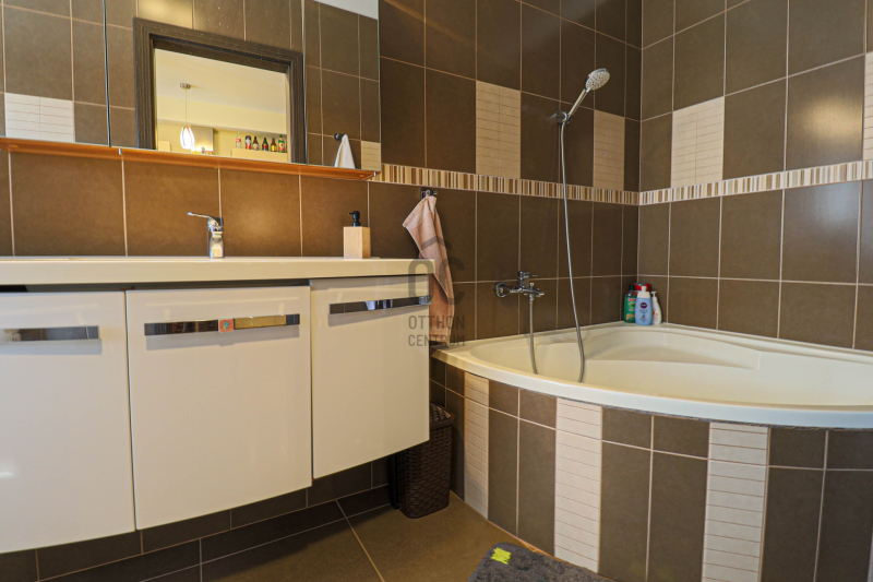 és közvetlen kijárat a 13 m²-es, burkolt, árnyékolóval ellátott teraszra