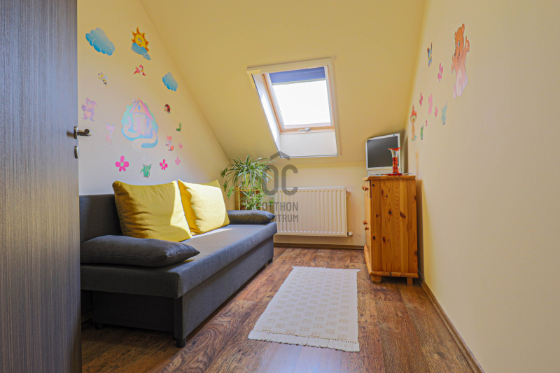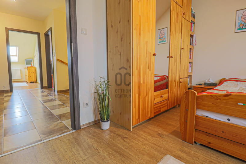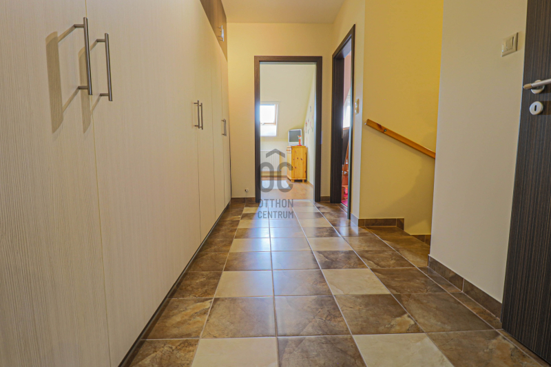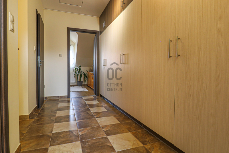 A közlekedőből elérhető padlástér további ~20 m² tárolási lehetőséget kínál.