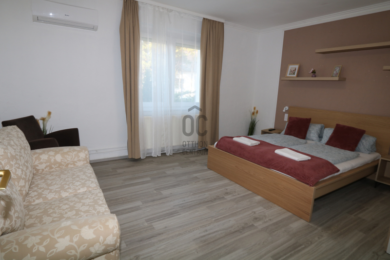 A környék ellátottsága kiváló, 6-8 percen belül megtalálható a vasúti megállóhely, a buszmegálló, bolt, étterem, fagyizó, stb. Az Aranypart és a frissen nyíló felújított Galerius fürdő gyalog mindössze 10-12 perc. Mindezek közelségével biztosítva a vendégek számára a pihenést és a kikapcsolódást. Az ingatlan befektetési szempontból kiemelkedő lehetőségeket rejt magában. A felkapott környék, az ideális helyszín garantálja, hogy a vendégek mindig visszatérjenek, ezzel biztosítva a stabil bevételi forrást. Az ingatlan tehermentes, birtokba vételét illetően a tulajdonosok rugalmasak.